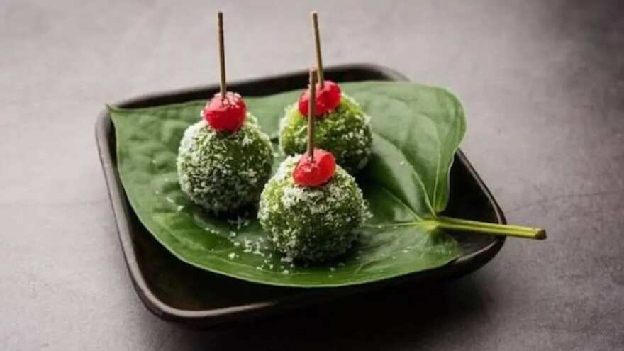 For a unique sweet preparation, paan ladoos are both symbolic and festive. Fresh betel leaves are ground into a paste and combined with desiccated coconut, condensed milk, and cardamom. The mixture is shaped into small ladoos and rolled in finely chopped pistachios. The green colour of the paan makes these ladoos visually aligned with the bhog of the day. Their refreshing taste and festive appearance make them a creative addition to the offerings while staying sattvic and suitable for worship.