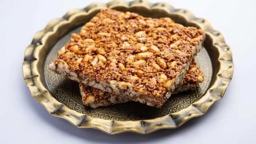 Rajgira, or amaranth, is another grain associated with fasting that can be transformed into a delightful chikki. By blending roasted rajgira with sesame seeds, almonds, or cashews, and binding them with jaggery, one creates a preparation that carries nutty flavours and symbolic colours. The combination of sesame and nuts introduces natural grey tones, making it suitable as a bhog for the sixth day. This dish is easy to prepare, stores well, and is cherished by both children and elders during the celebrations.