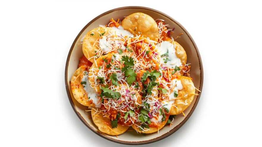 This version of papdi chaat swaps the regular flour with singhara or water chestnut flour to make the crispy papdis. Topped with mashed potatoes, yoghurt, vrat chutneys, and crunchy peanuts, it imitates the flavours of regular authentic papdi chaat. The use of rock salt and pomegranate seeds adds freshness and a festive touch. Excellent for those who miss classic chaats during fasting days, singhara papdi chaat blends crunch, creaminess, and spice in a vrat-compliant, guilt-free way.