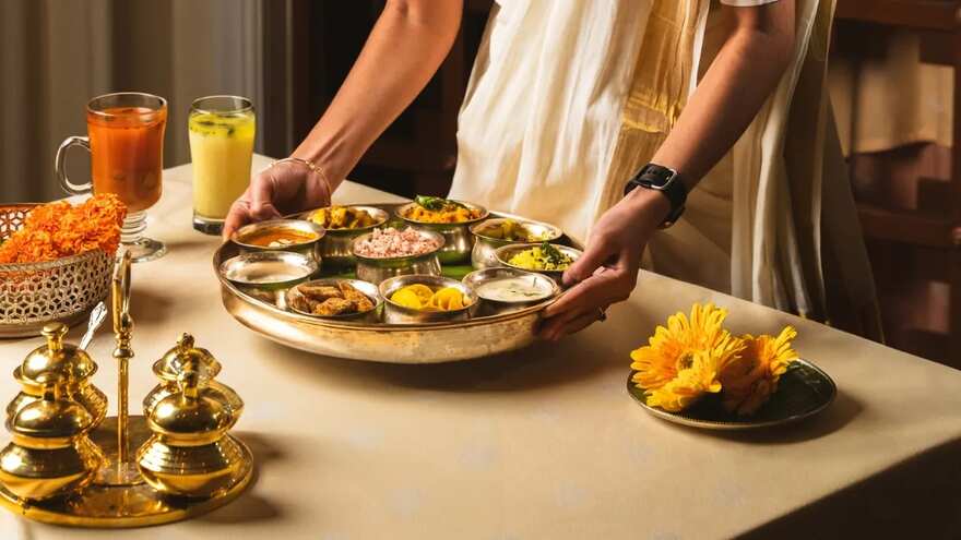 The Ritz-Carlton, Bangalore presents an elaborate Onam Sadhya Brunch served in the traditional banana leaf style to celebrate Kerala’s most cherished festival. An opulent array of authentic preparations follows from Karamani Thoran and Vellikra Pachadi to the comforting Avial, delicate Olan, hearty Kootu Curry and the distinctive Mambazha Pulissery. The spread continues with the soulful flavours of Mor Kuzhambu, fragrant Sambar and tangy Rasam, served with Matta Rice. Essential accompaniments like Inji Puli and crisp Pappadam enhance the experience, before the feast culminates in sweet indulgence with Paal Kolukattai and the beloved Paruppu Payasam.