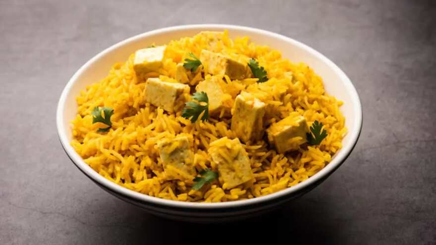 Did someone say paneer? This rice-based dish is lightweight, loaded with protein, and screams wholesomeness. Saute onion, ginger, garlic, cumin seeds, and green chillies in a flat-bottom pan. Add paneer cubes and cook them until they are golden brown. Add soaked basmati rice into the mix along with diced carrots, vegetable broth, and peas. Season the ingredients with salt, pepper, and some spices, and cook them with the lid on. Once rice is cooked to perfection, garnish with coriander leaves, and turn off the heat. Enjoy it hot.