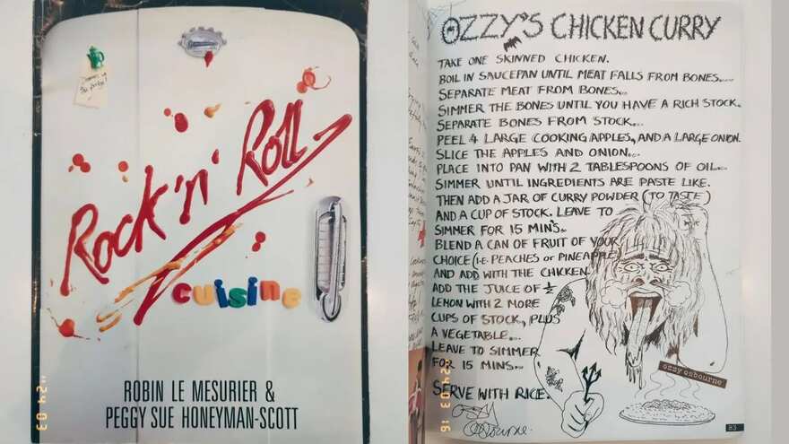 The book featured a compilation of recipes from musicians spanning the full gamut from AC/DC to Zappa, Frank, most often with the recipes penned on paper in their own hand and scanned into the compendium. Ozzy’s contribution you ask? Chicken curry. Albeit with his own…unique touch. The recipe as listed includes Ozzy’s is ‘One (skinned) chicken, apples, onion, a jar of curry powder, stock, a can of fruit of your choice (i.e. peaches or pineapple), lemon juice, and a vegetable over rice.’ Though it’s fascinating that this is out there in the world, it's definitely an exotic bunch of ingredients to pull out for a curry.