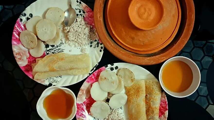 The first grain of the year is stocked up and celebrated in a beautiful and dignified manner. In Bengal, this is called ‘Nabanno’, which means ‘new rice’. This is what ‘Poush Sankranti’ or the concluding day of the Bengali month of Poush also means. Date palm jaggery, also known as nolen gur, is widely available throughout the entire state. Every household prepares a variety of traditional sweets, which are primarily made using rice, flour, milk, and nolen gur. These desserts are termed as ‘pithe’ or ‘pitha’. On that day after puja, everyone has a traditional lunch with khichuri, and then in the evenings, the prepared variety of pithe is served. Dudh puli and atishapta are the two most common pithe that are made in every Bengali household. You can say, pathishapta is a modern twist with a touch of Bengal when it comes to crepes. It’s paper-thin, stuffed with coconut and nolen gur, and every bite makes your eyes roll.