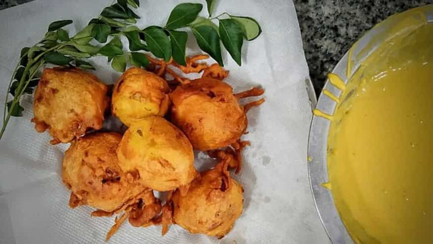 This is another fusion dish which brings together crispy potato croquettes with southern Indian sambar in a street food-style delight popularised for its bold and spicy flavours. The batata or potato vada is crispy on the outside and soft on the inside. It is served warm in a small plate and topped off with piping hot, flavourful sambar.