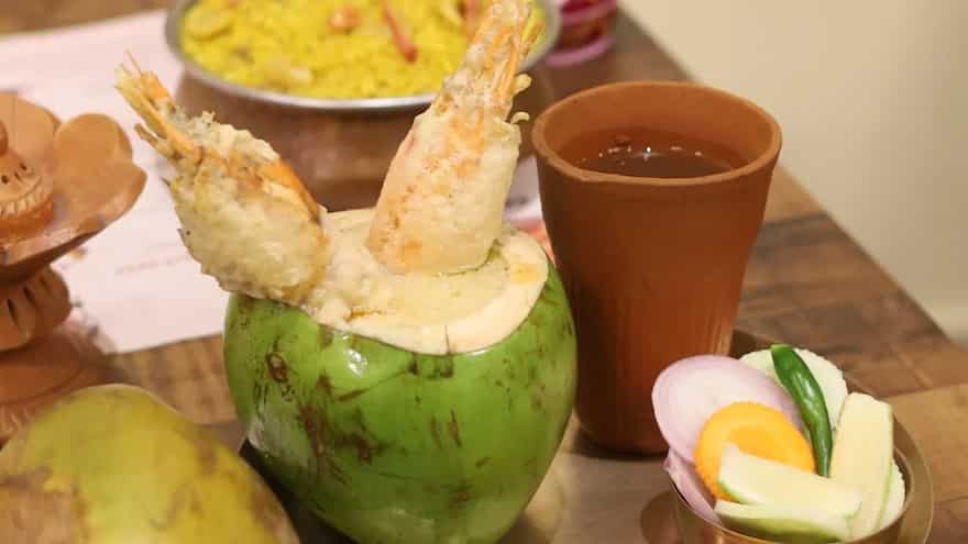 Marinate prawns with salt and freshly prepared coconut water-based special masala, and mustard oil. Next, you have to stuff the marinated prawns back into the empty coconut shell. Seal the top and bake the coconut in an oven until the prawns are cooked. The prawns soak up the natural sweetness of the coconut shell, creating a flavour that is truly "Bong."