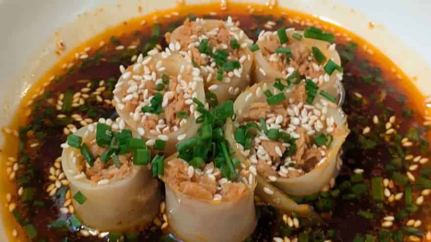Next on the table was Sesame Chilli Lepphing, a famous Tibetan street food reimagined by the chef. The heavenly combination of cold mungbean rolls, mock meat, and sesame chilli oil makes it a must-have for those who love Asian flavours. It's sour, flavourful, and has a hint of chilli, making it a standout dish at Popo's.