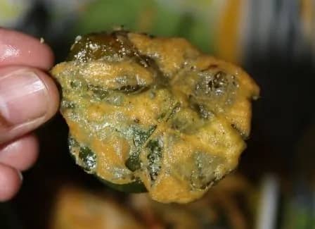 The pumpkin leaves become crisp on the outside while remaining soft on the inside, giving Kumro Pata Bora a mildly toasted flavour. It differs from ordinary vegetable fritters in that it has a savoury depth and a mild bitterness. Before cooking, they are evenly coated after being dipped in a seasoned besan mixture. The heat changes the texture, giving it a sharp bite that accentuates the leaf's structure. Since pumpkin leaves quickly acquire flavour and keep their shape well, they naturally fit into this fritter prep. The crunchy edges of the dish help balance softer meals, which is why it is frequently paired with rice.