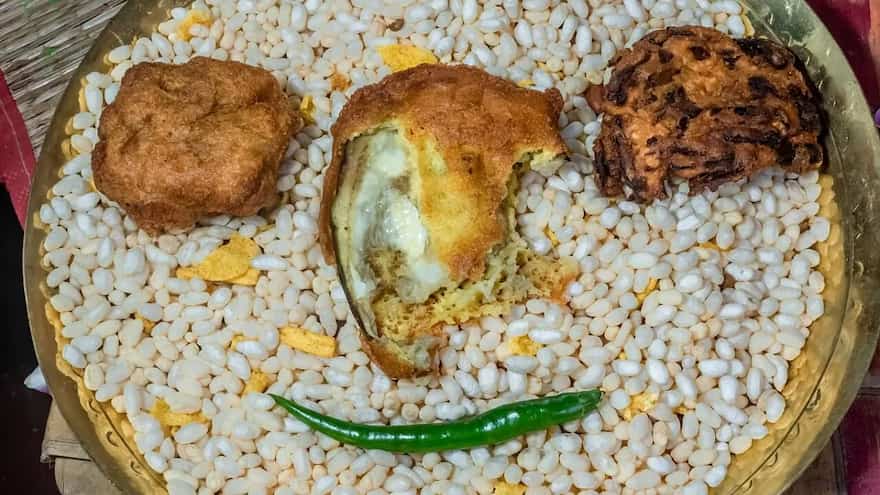 The popular Bengali street food jhalmuri is renowned for its acidic, spicy, and crunchy tastes. With its delectable combination of puffed rice, chopped onions, tomatoes, and green chillies, slivered coconut slices, boiled or fried Bengal gram, toasted ground almonds, chutneys, and spices, it's a great and practical option for a light lunch or on-the-go snack. People of all ages love this delicious snack when taking a stroll in parks, shopping, or just resting on a calm evening.