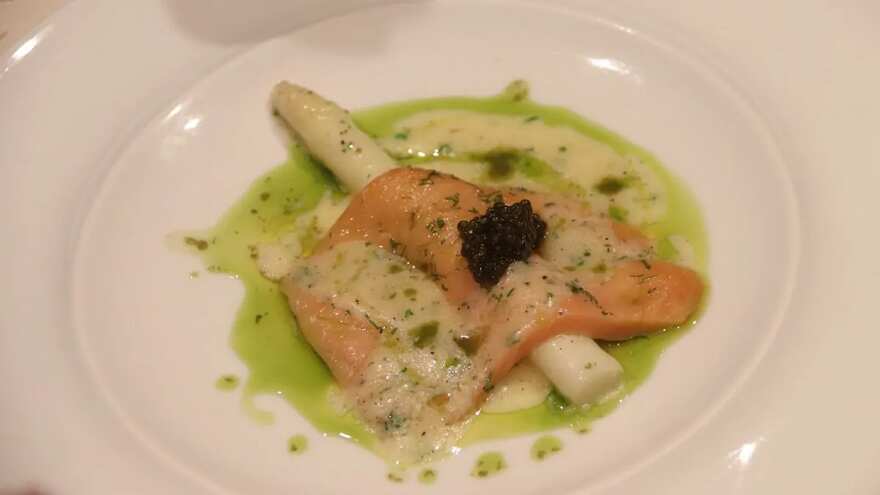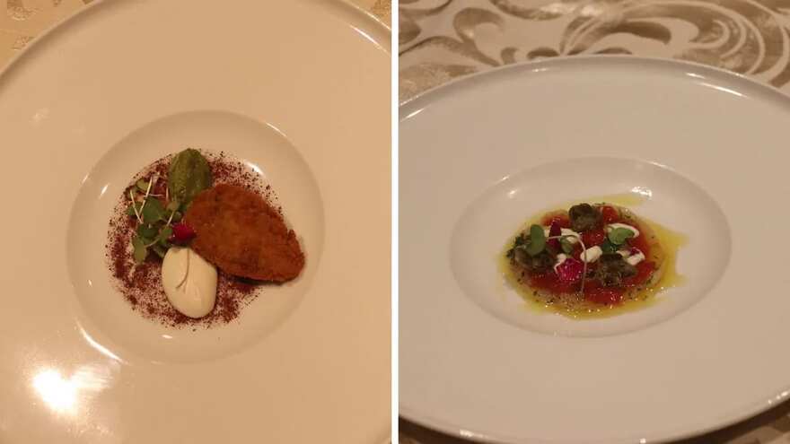 Testament to this in the courses that follow - marinated burrata topped with a sour cherry glaze, toasted almonds and mesclun greens disintegrates on the palate to make way for clean, rounded off flavours; a welcome combination of soft, slightly chewy and crunchy textures. The next plate - one admittedly close to the chef’s heart - arrives with smoked salmon resting on a spear of white asparagus, a buttery glaze of parsley and pinot grigio, the freshest Oscietra caviar finished with a basil oil drizzle - elements that Zubin is no stranger to presenting with flair. Peppered in between courses were fun little surprises - one of which was a freshly made canape of chicken liver pâté spread thickly over toasted ciabatta and dusted with cocoa - meant to be eaten with a drizzle of extra virgin olive oil. For the pâté-averse like us, the bitter accent elevated a surprisingly mellow savouriness in what’s best described as a forged friendship of unusual elements.