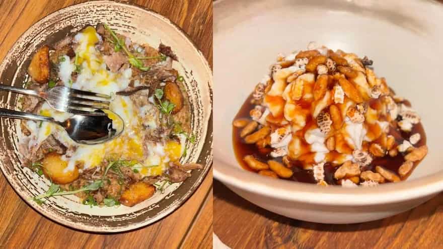 Sticky rice and fried rice came together to create the cosy dish known as hangover rice, which comes in duck and mushroom varieties. The long-smoked mushrooms provide a rich texture, while the rice absorbs depth from the stock. Coconut Pandan Pudding: This dish combines smoky puffed rice with creamy coconut and pandan pudding. It is drizzled with dark, nutty nolen gur and topped with a lime peel for scent. After only one taste, we were unable to stop.