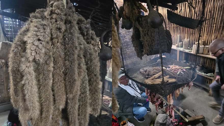 Each tribe builds its own morung inside Kisama. Traditionally, a morung was a youth dormitory; a place where boys learned discipline, warfare, craft, and oral history. Structurally, they are imposing: heavy timber, carved posts, bamboo lattices, steep roofs built to withstand weather and time. During Hornbill, these morungs transform into kitchens. But they are not stalls. That word suggests commerce. These are temporary embassies. Inside, meat hangs from rafters; pork bellies, ribs, slabs of fat, sometimes whole sides, blackened by smoke. Fires burn low beneath them. Smoke cures, preserves, and flavours. This is not decorative. It is functional preservation, the same method used for generations in villages where refrigeration was never an option. The smell is unmistakable. Sharp. Animal. Alive. Men tend the fire and the meat. They sit close, watching quietly. Women control everything else.
