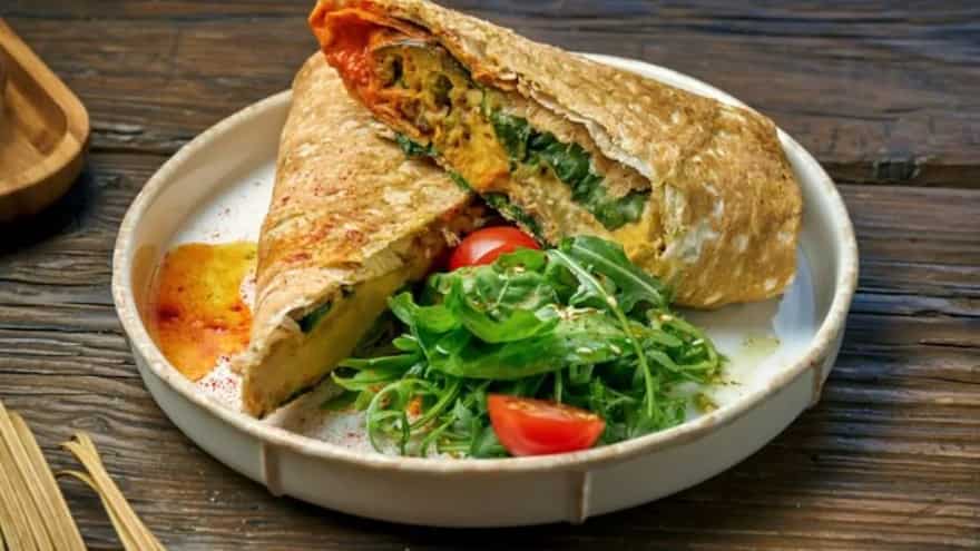 This is a desi version of the burrito, but it is a bit lighter and quicker. Simply beat two eggs with some finely chopped spinach, coriander, green chilli, pepper powder, red chilli powder and a pinch of salt. Cook it like an omelette and place a warm roti on it. Roll this gently with a swipe of green chutney. The spinach turns soft into a buttery bite while the eggs remain fluffy and fragrant. Spinach masala omelette wrap is a good grab-and-go breakfast option when you are running late but still looking for something filling, protein-rich breakfast option.