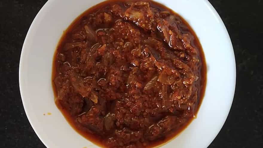 This recipe has several versions; some add ginger and tomatoes while others are made with just red chillies and garlic. You can also add a tablespoon of it to the curry for depth and slightly pungent notes.