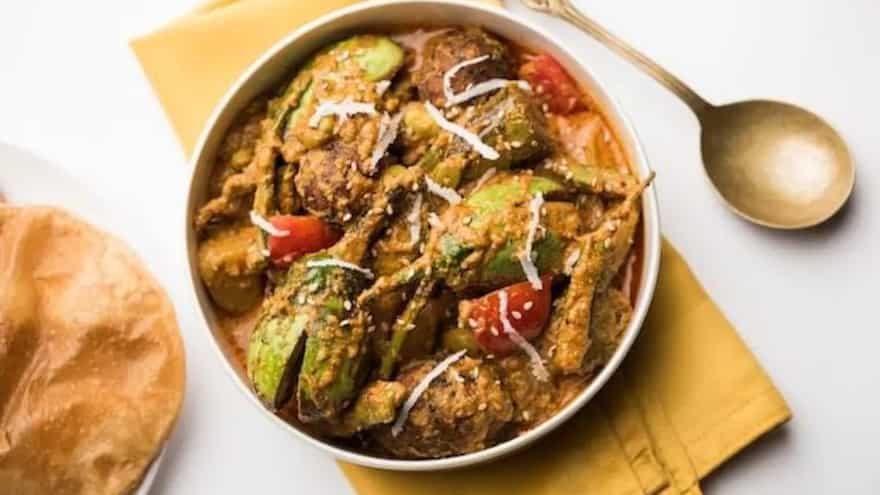 The vegetables are placed in a thick pan and covered with a steel plate. The dish cooks slowly on a low flame. Water is added just once. After that, the steam inside the vessel cooks the food. People usually eat this with bajra rotla or soft phulkas. It is also eaten with plain rice and khatti-meethi dal in many homes.
