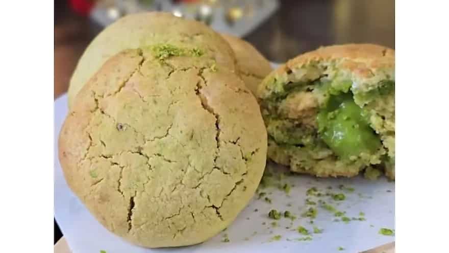 7. Take small portions of dough, make a cavity, add 1 tsp pistachio paste, and seal well.