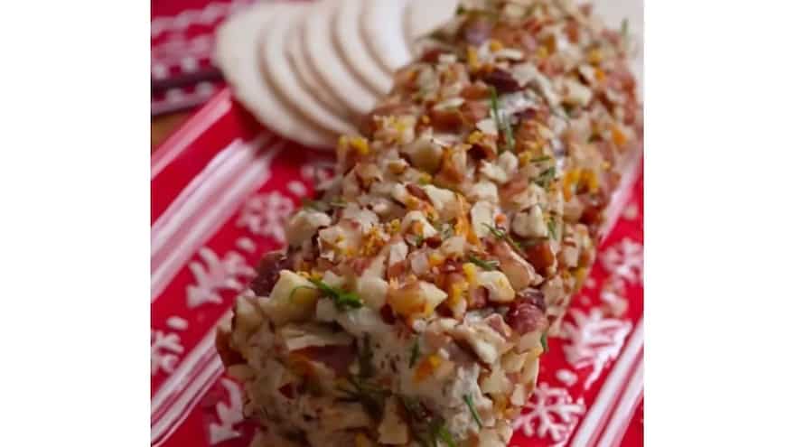 6. Remove, unwrap, and roll in chopped pecans, orange zest, and dill leaves.