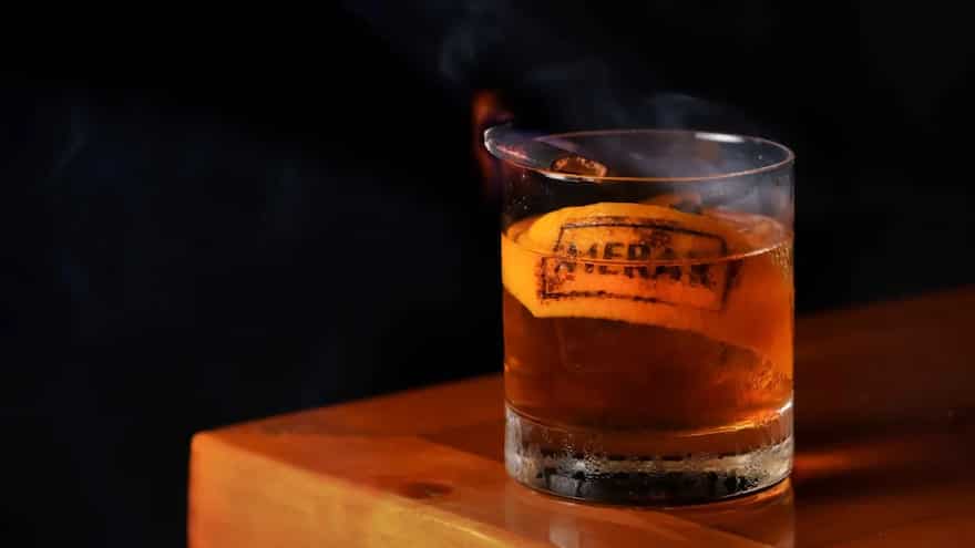 - Prepare the serving glass by igniting a cinnamon stick and trapping the resulting smoke inside the glass to infuse the aroma.