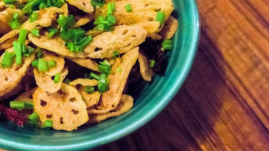 If using fresh lotus root stems, wash them thoroughly, as they will have come from muddy waters. Then peel them and cut them into thin slices diagonally. Wash them again and wipe them clean. Dust with cornflour and spread it over the stems with your clean fingers.