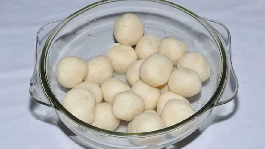 After the curds have drained, transfer them to a clean work surface and knead gently for a few minutes until the curds come together and form a smooth texture. Divide the chenna into small portions and roll them into smooth balls. Ensure there are no cracks or lumps. In a separate large pot, heat the sugar and milk over medium heat. Stir occasionally until the sugar dissolves and the milk begins to thicken. Add the saffron strands and ground cardamom to the milk, stirring well to distribute the flavours.