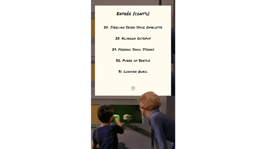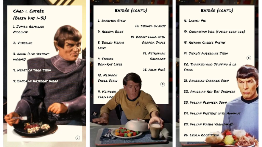 Put them together, and voilà: your very own menu worthy of Quark’s bar or the Captain’s table!