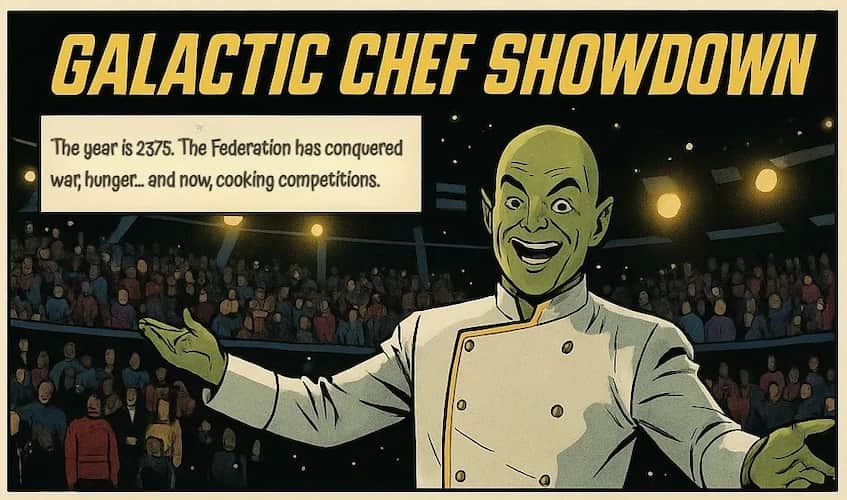 Welcome, galactic gourmands and culinary cadets, to the very first episode of GALACTIC CHEF SHOWDOWN! Tonight, across these polished counters, Federation heroes will lay down their tricorders and pick up their spatulas. Their mission: to boldly cook where no chef has cooked before!