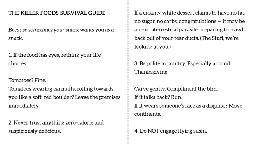 Welcome to the unofficial compendium of killer foods — a Thanksgiving-adjacent guide to every appetiser, entrée, and dessert that has risen up on screen to hunt, slice, digest, or psychologically traumatise humanity.