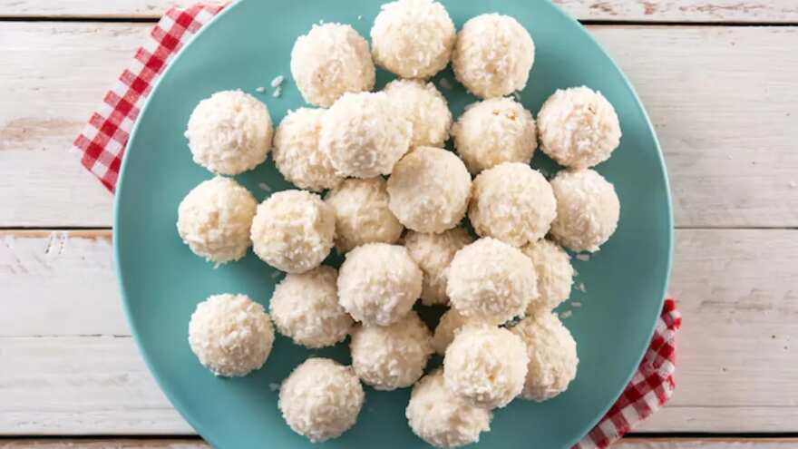 Coconut laddoos, rolled with sugar or jaggery, were an East Bengal staple — made during festivals and as travel food.