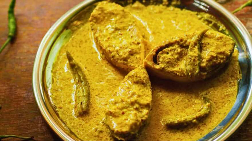 One of the culinary emblems of East Bengal: fish, usually hilsa, marinated in mustard paste, turmeric, and mustard oil, then steamed or simmered. The taste was unapologetically bold — pungent mustard heat matched against the rich oiliness of the fish.