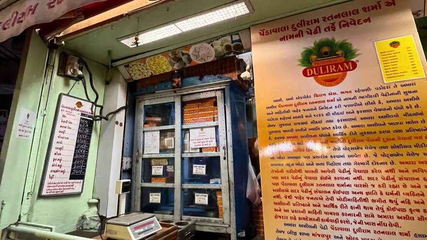 The story of Duliram goes back to the 1840s, when brothers Maharam and Duliram Sharma migrated and set up their sweet shop in Jambubet. At that time, the Gaekwad rulers were patrons of food and culture, and Duliram’s craft quickly drew their attention. Their Mathura pedas travelled to the royal courts, and eventually even to England, where Maharaja Sayajirao Gaekwad III carried them to Queen Victoria. Over the years, stories of elephants refusing to move until fed a peda and royal recognition shaped the shop’s place in the city’s collective memory.