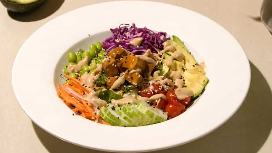 - Arrange tofu, avocado, and all vegetables separately on top.