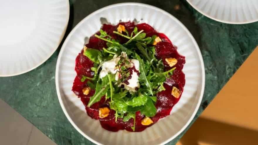 - Add small dollops of mascarpone-chive mousse and stracciatella over the beetroot.