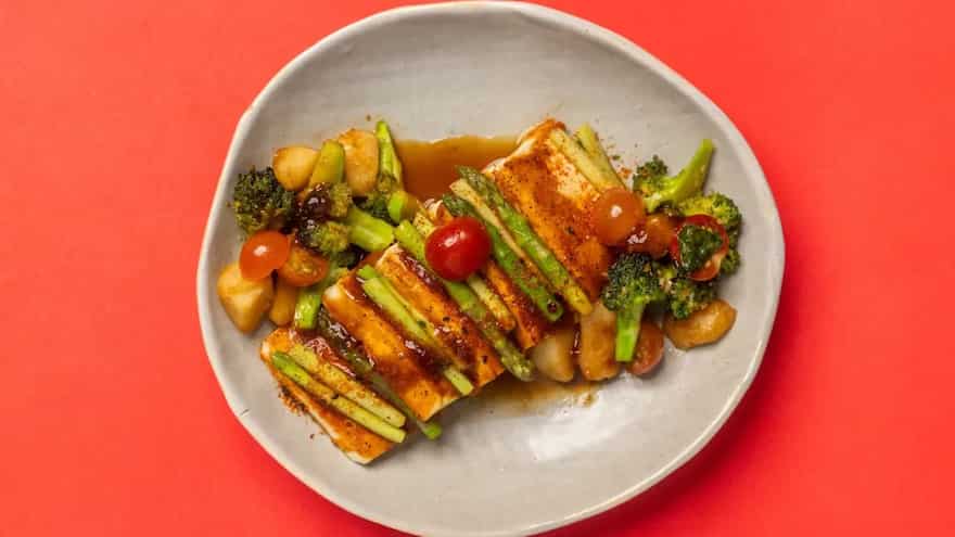 5. Add asparagus: Toss the blanched asparagus in a little hot oil, season with salt and pepper, and neatly arrange over the tofu. Lightly glaze again with the sauce.