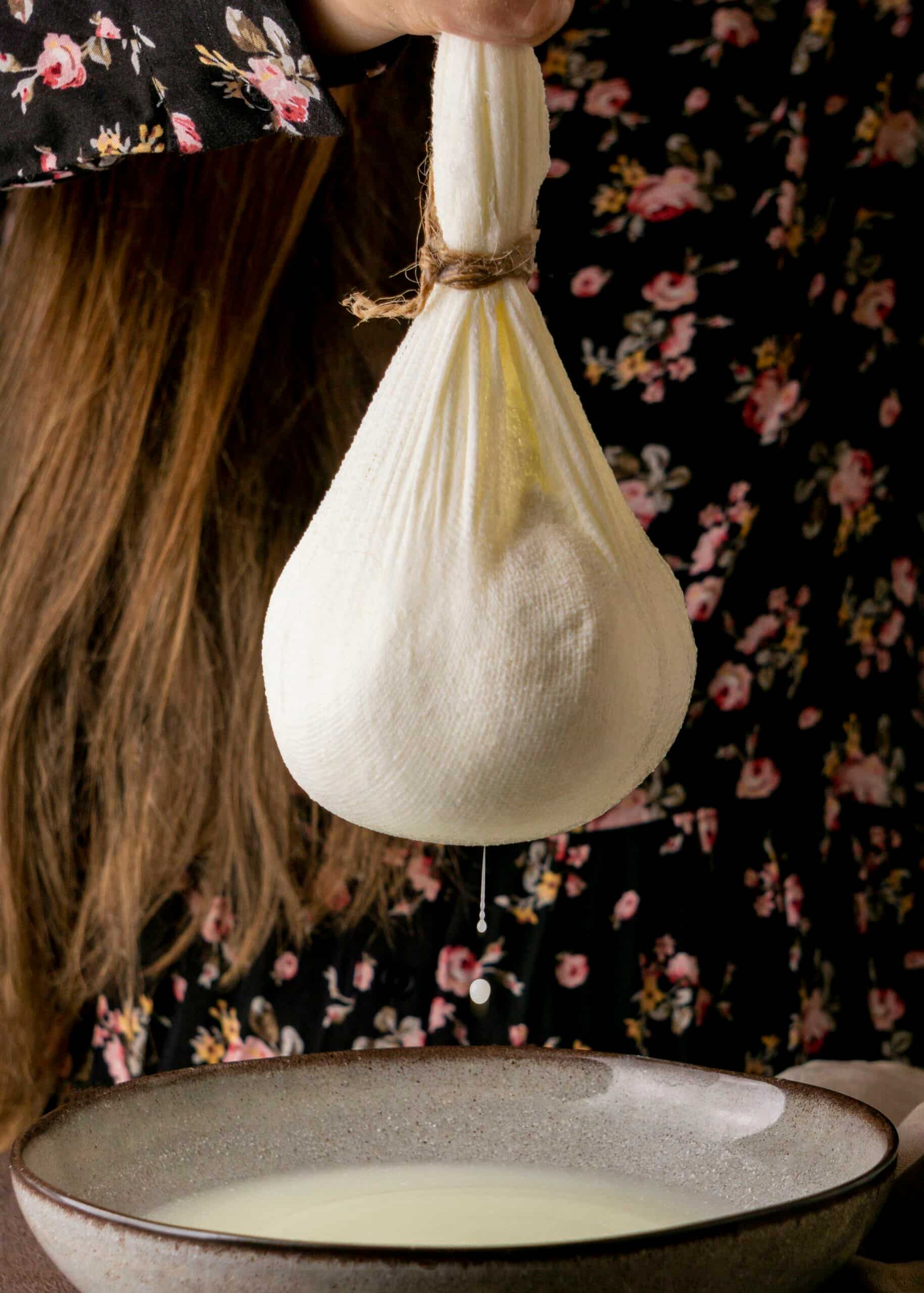 Let the water drip out, leaving thick-textured curd inside the cloth.