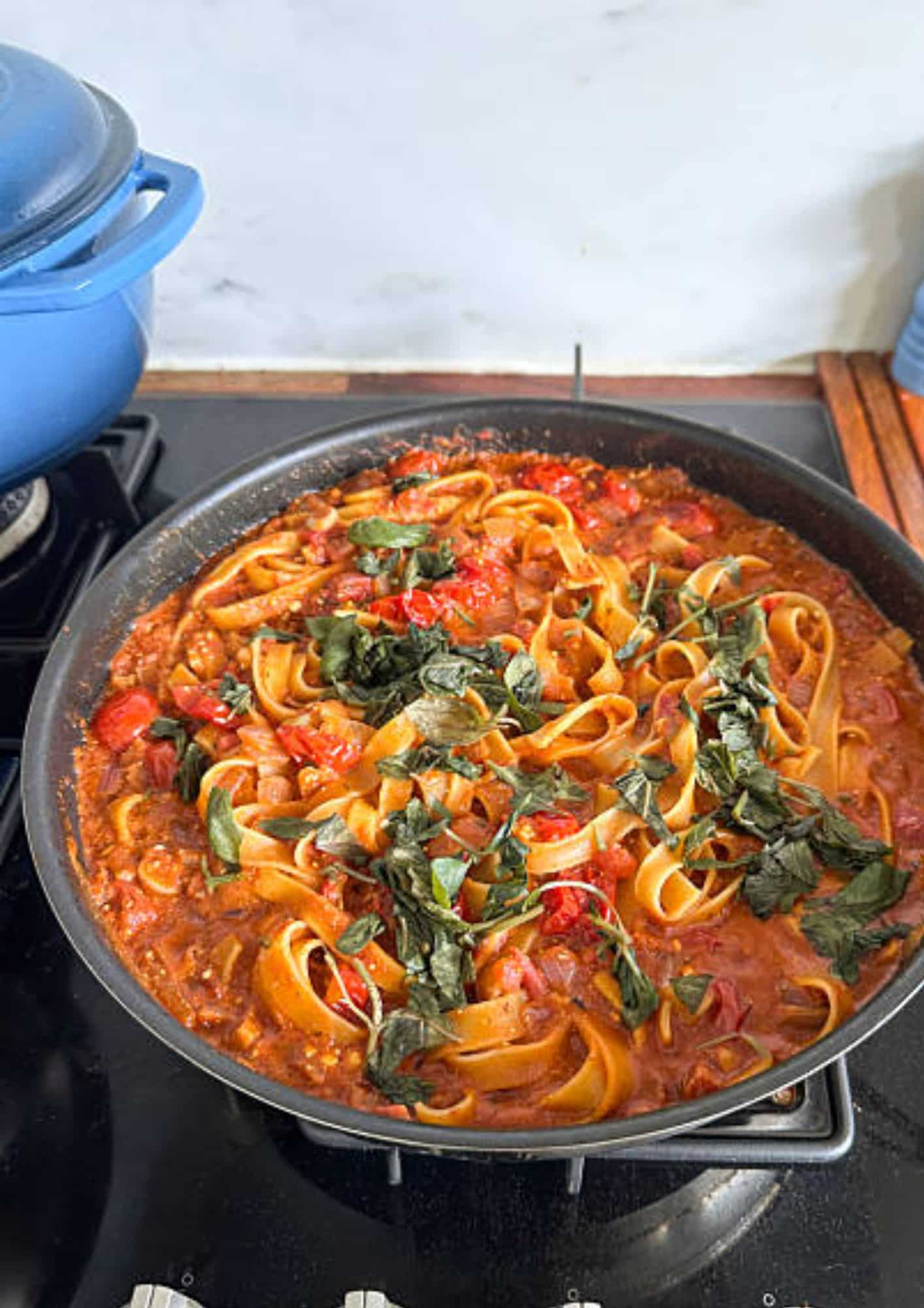 Pasta cooks away in a big pot of tomato sauce, and it is the perfect way to soak up all the flavours in one go.