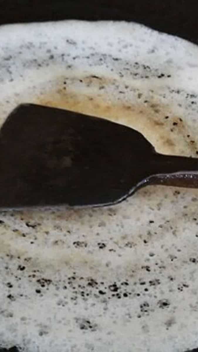 Spread a thin layer of batter on the tawa using two ladles of batter and circular motions.