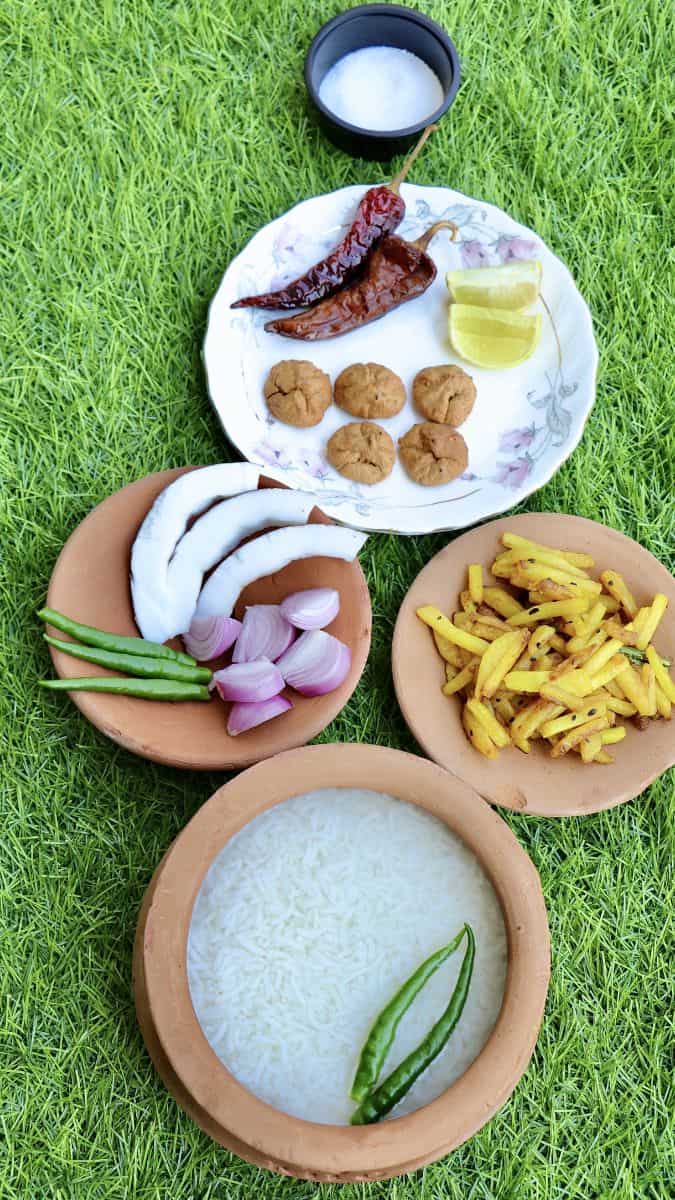Mix the ingredients and dress with a pinch of salt and lime juice. Serve panta bhaat as a whole meal.