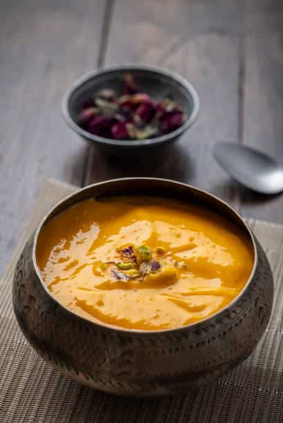 Ripe mangoes melt into a smooth, fragrant aamras that tastes like pure summer. Naturally sweet with a hint of cardamom, this chilled delight pairs perfectly with pooris or works as a quick dessert.