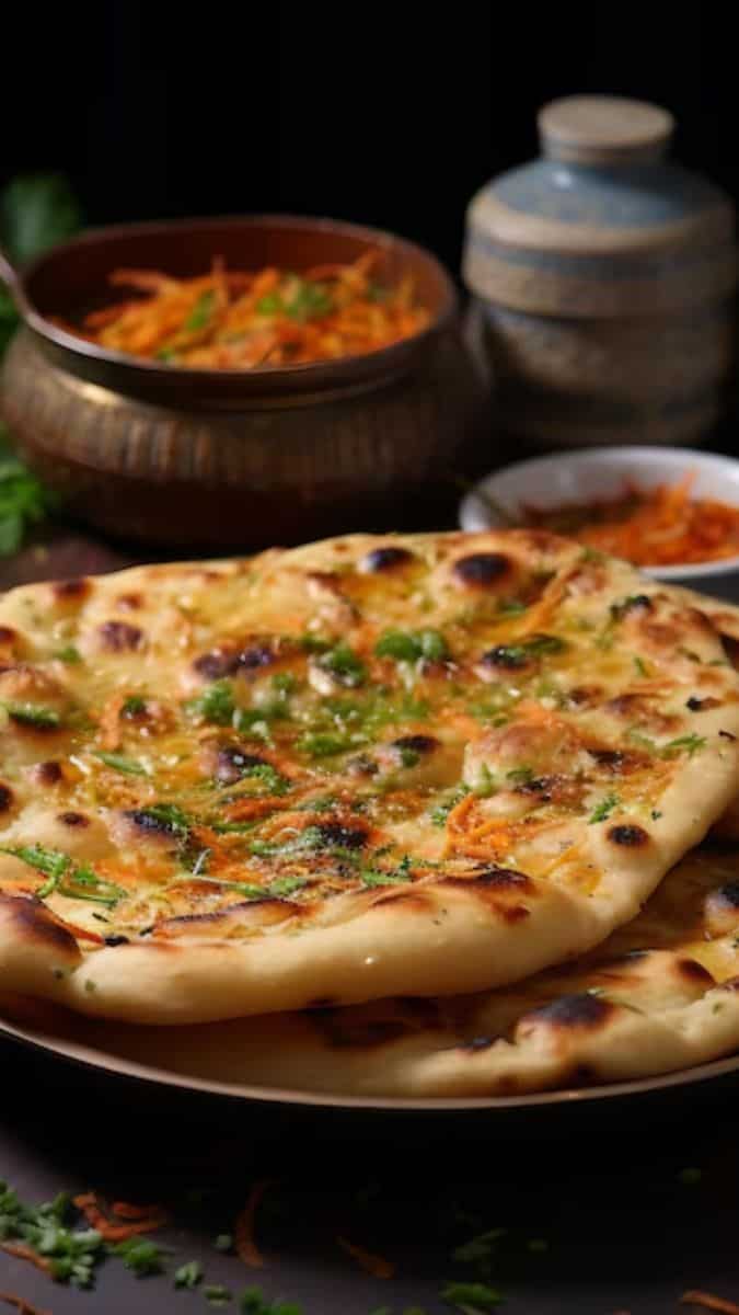 Aloo pyaaz kulcha is a soft, tawa or tandoor-cooked flatbread which is loaded with spicy potato and onion stuffing. This North Indian favourite tastes amazing when paired with chole, raita, or pickle, turning every bite comforting and extremely satisfying.