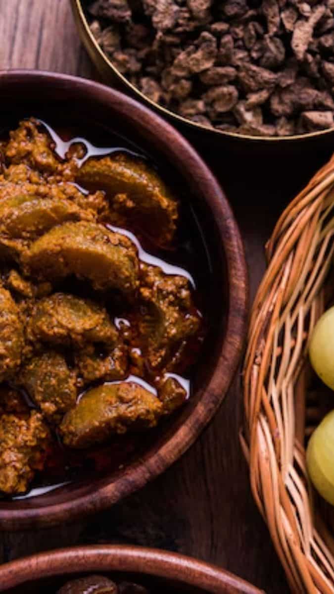 Amla achar is a sharp, flavourful Indian pickle made with fresh gooseberries that are naturally rich in vitamin C and iron. It has long been prepared in Indian kitchens as a way to preserve amla while supporting immunity through seasonal changes. The bitterness of the fruit softens as it cooks slowly in oil and spices. This pickle pairs especially well with simple meals like dal, curd rice or khichdi.