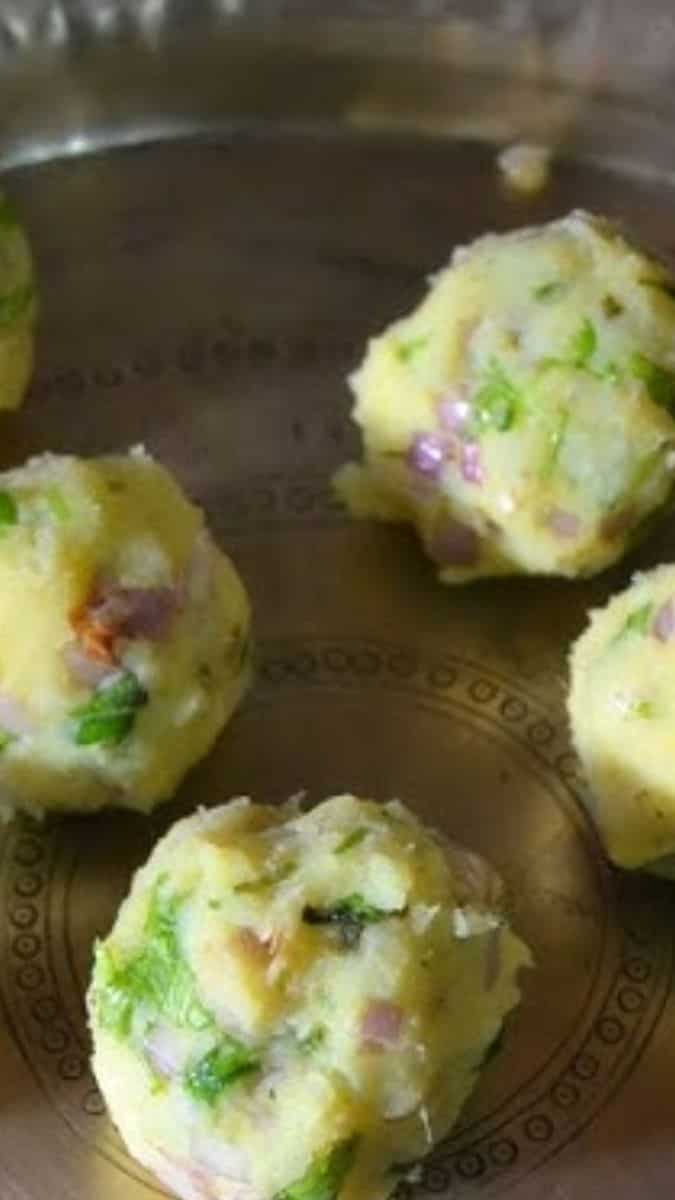 3 boiled potatoes 2 red chillies 1 tbsp mustard oil 1 sliced onion A pinch of hing 1 tbsp coriander leaves Salt to taste 1-2 chopped garlic cloves ½ tsp mustard seeds