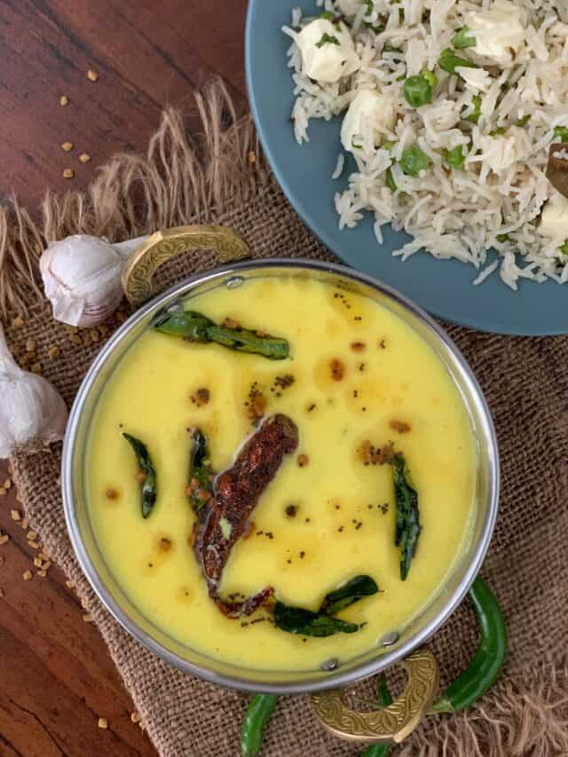 Rajasthan kadhi is a delight for the taste buds as its tangy and spicy notes play a symphony in your mouth. When paired with steamed rice and topped with aloo ki sabzi or bhindi, the bowl represents a comforting meal. Here is the recipe.