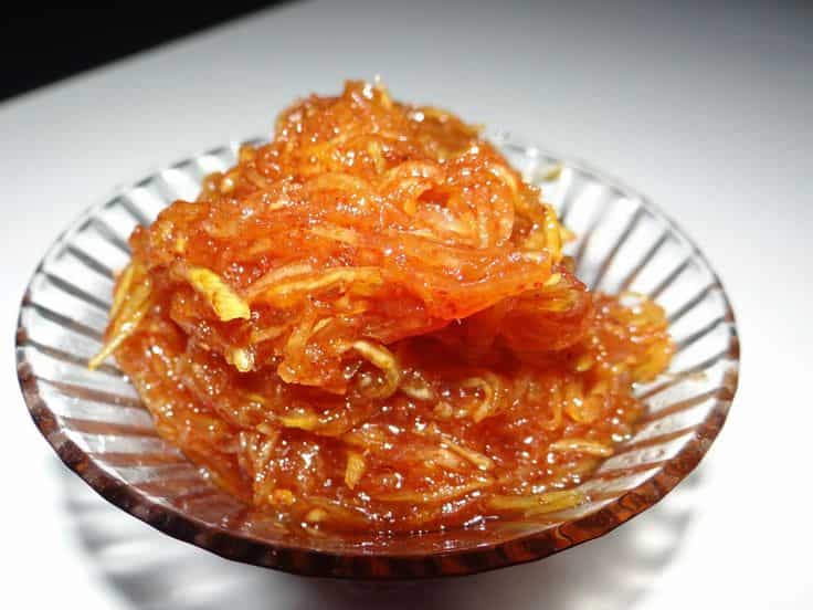 Combine the grated mango and sugar in a large glass bowl and let it rest until the sugar dissolves into a thick syrup.