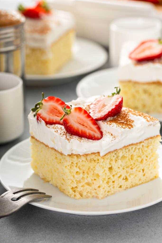 Tres leches cake relies on a light sponge that absorbs liquid without collapsing. The cake itself is intentionally dry and airy so it can take on the three-milk soak and still hold its structure. It is always served chilled, which allows the milk mixture to settle evenly through the crumb.