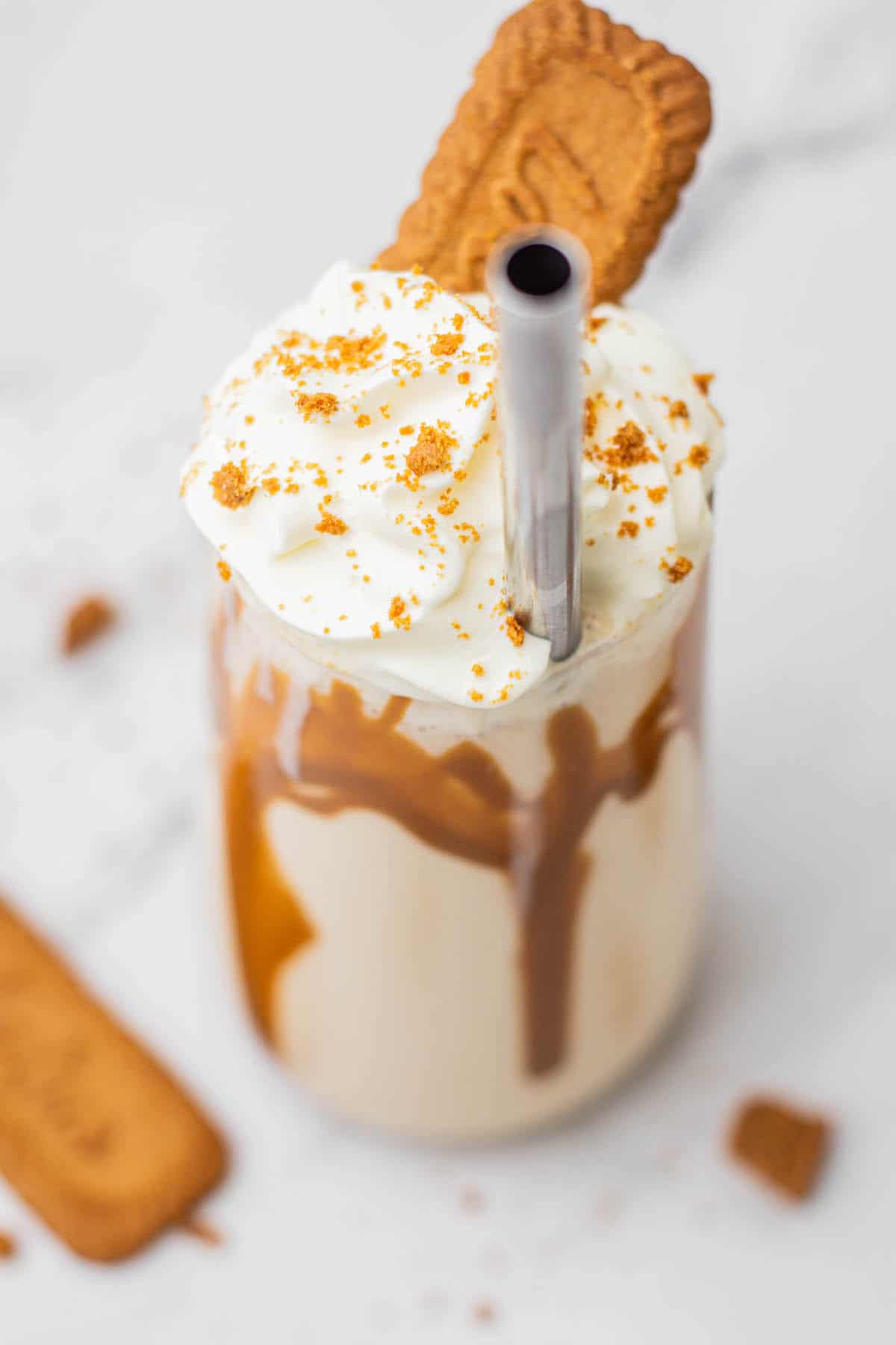 2 tbsp Lotus Biscoff spread 1 ripe banana 1 cup chilled milk ½ cup yoghurt 1 tsp cocoa powder (optional) Ice cubes as needed