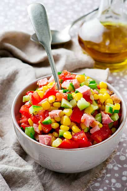1 cup boiled corn kernels 1 small tomato (finely chopped) 1 onion (chopped) 1 green chilli (chopped) 1 tbsp lemon juice 2 tbsp coriander leaves (chopped) Salt and pepper to taste