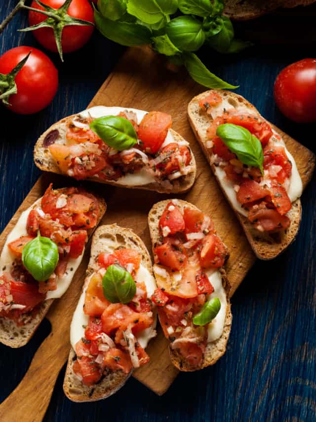 Bruschetta is a rustic Italian starter made with crisp toasted bread topped with a bright, garlicky tomato mix. The freshness of ripe tomatoes and basil is what gives the dish its signature flavour. A good bruschetta relies on quality olive oil, balanced seasoning and bread that stays crunchy under the topping.