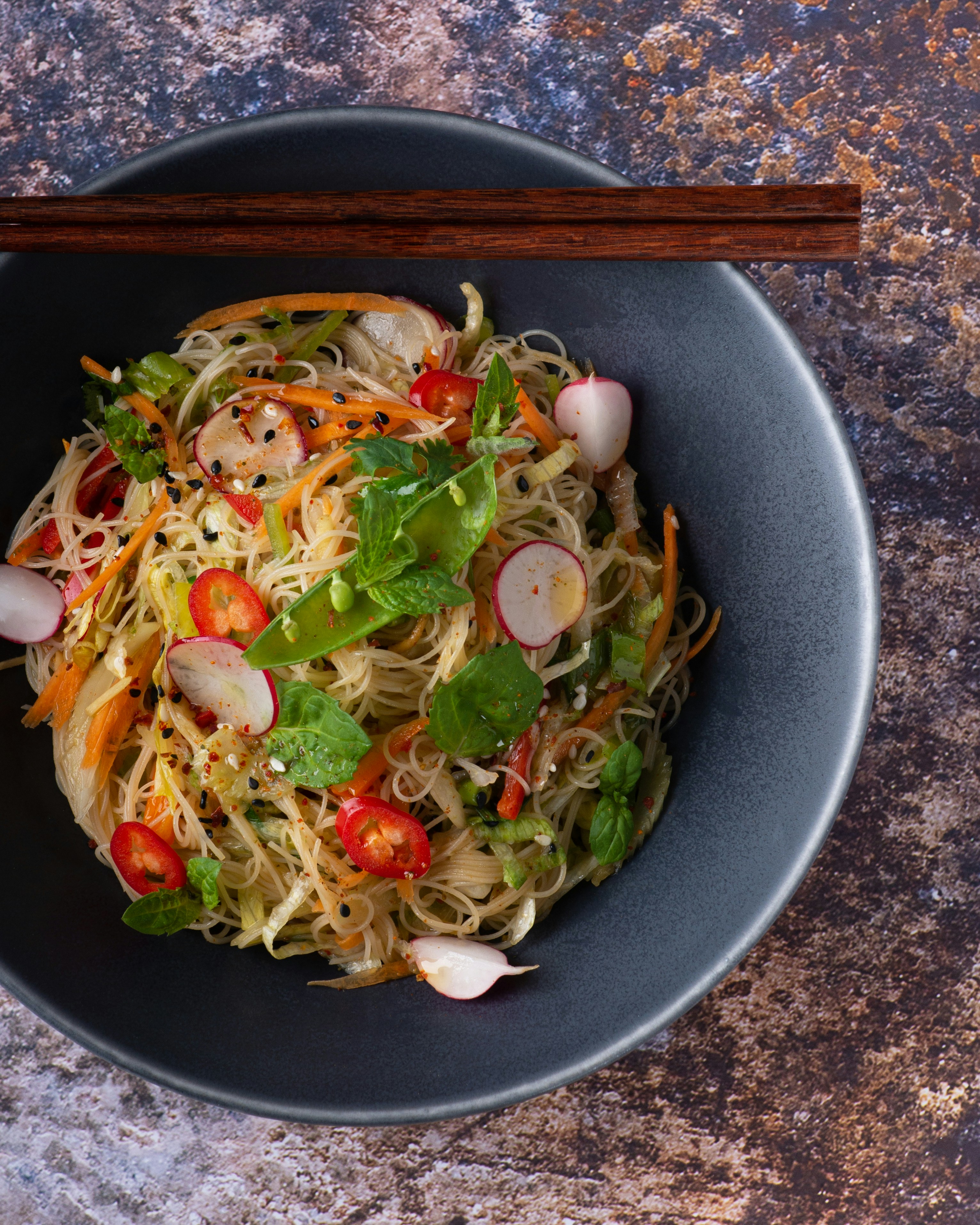 Pour the dressing over the veggie and chicken mixture and toss to coat. Cover the bowl with plastic wrap and chill for 4 hours or up to overnight. Stir in the cilantro, green onions, ramen noodles, almonds, and oranges.