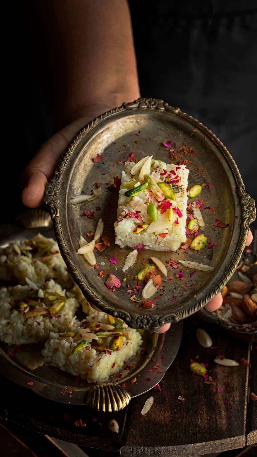 Kalakand is a milk-based sweet from eastern India, mainly West Bengal and Orissa, that differs from other milk sweets because of its fresh, grainy texture. It achieves a soft consistency by combining chenna with reduced milk. The sweetness stays mild, allowing the flavour of milk to dominate instead of sugar.