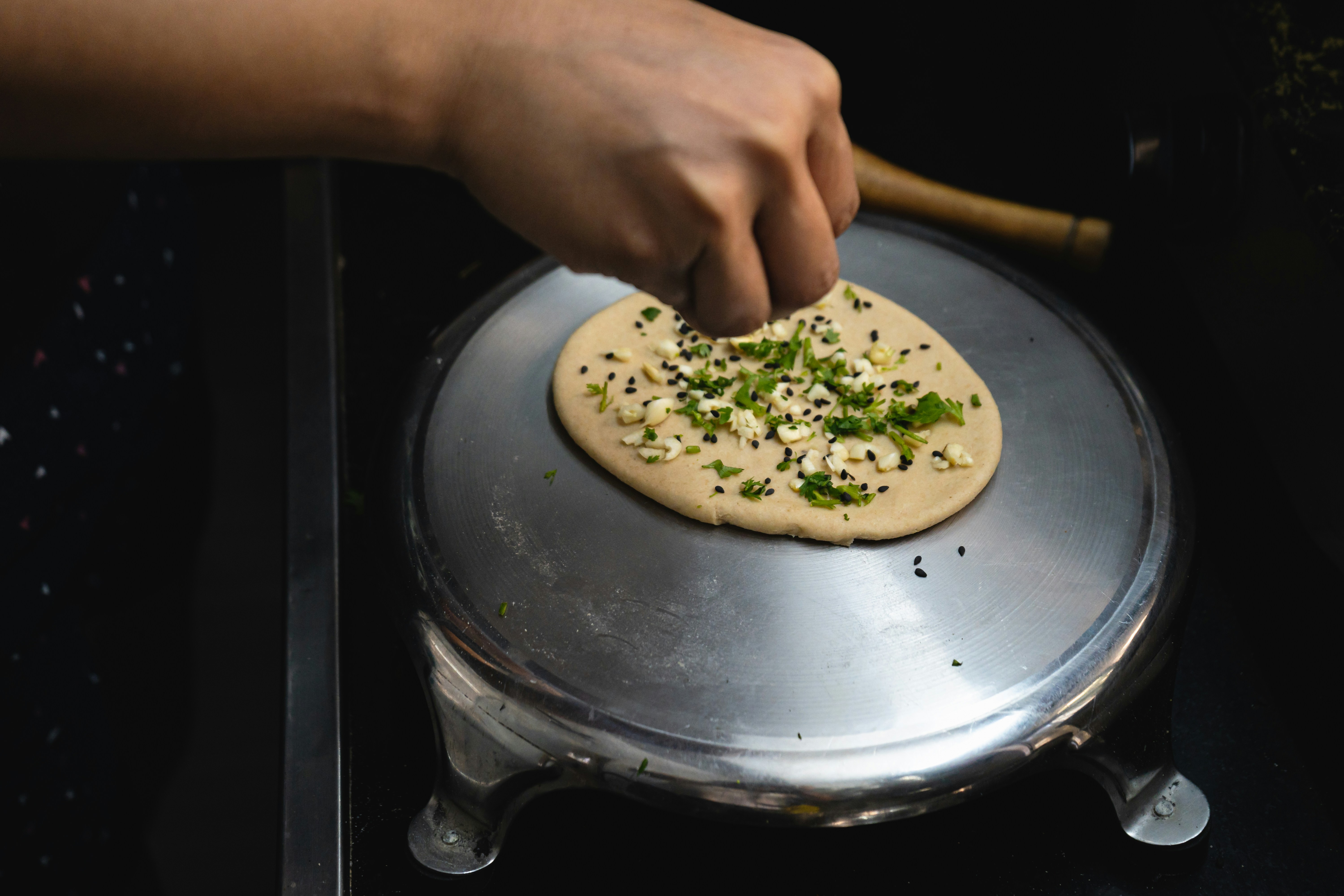 1 cup wheat flour, maida 3 tbsp water ½ tsp nutritional yeast, salt 1 tsp sugar 1 tsp nigella seeds 2 tbsp oil 3 tsp garlic ½ cup water 4 tbsp butter 2 tsp mint, coriander leaves