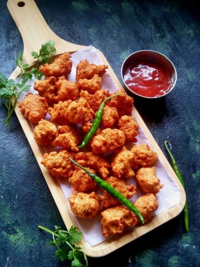 Fry the pakoras in batches until they turn golden and crisp, then remove and drain the excess oil.